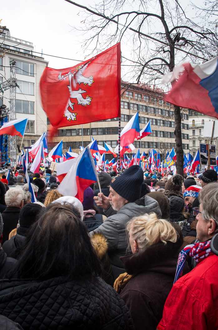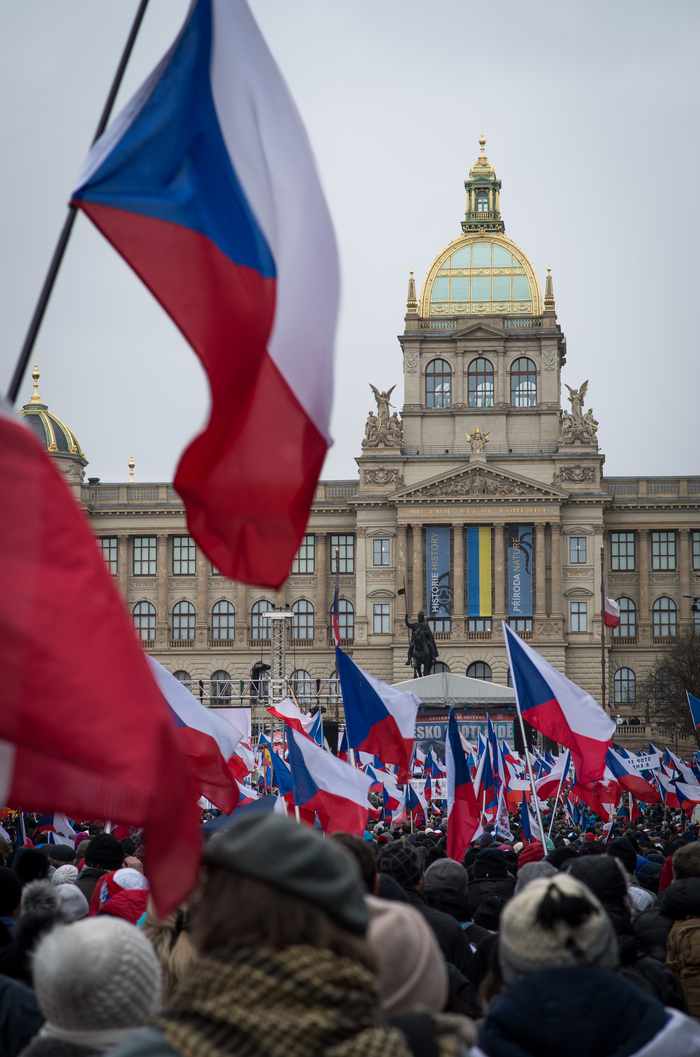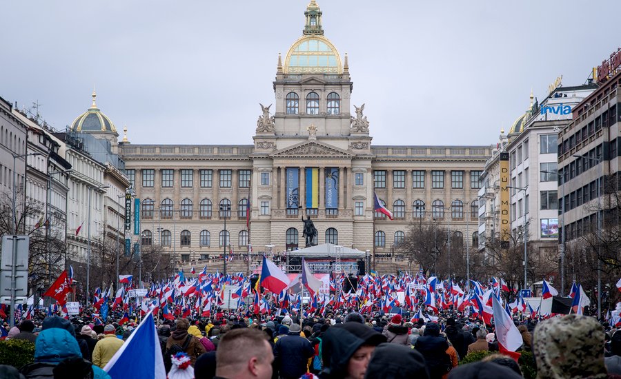 Zhruba pět stovek demonstrantů proti vládě Petra Fialy [ODS] se dnes [11.3.] na Václavském náměstí dožadovalo sundání ukrajinské vlajky z budovy Národního muzea nad pomníkem svatého Václava. Policie ČR jim v tom zabránila.