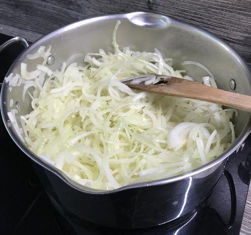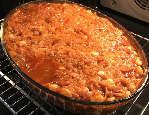 Připravíme zapékací mísu nebo hluboký pekáč. Na dno dáme první vrstvu cibulového základu a na ni přidáme vrstvu fazolí, pokračujeme další vrstvou cibulového základu a vrstvou fazolí. Navrch dáme poslední vrstvu cibulového základu.