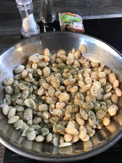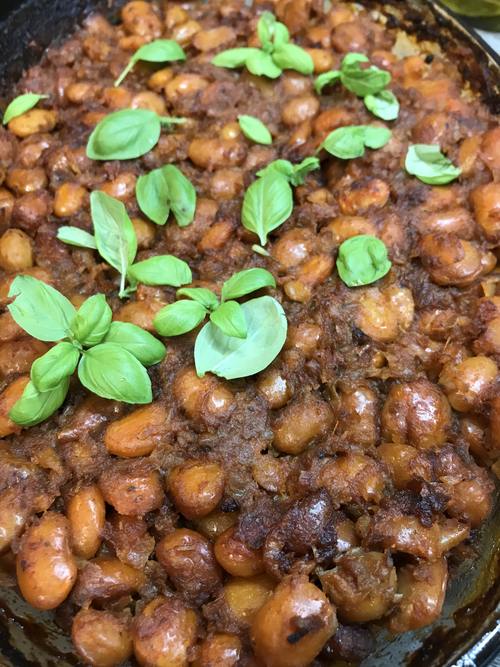 Zapékací mísu zakryjeme a vložíme do trouby. Po 20 minutách mísu odkryjeme a zmírníme pečení na 185 C. Pečeme zhruba ještě hodinu za občasného promíchání. Fazole nepečeme nasucho. Takže v případě potřeby dolijeme vývarem či vodou. Před vyndáním z trouby bude tekutina již odpařená, fazole a cibule budou vláčné. Následně vmícháme bazalku a petrželku, případně dosolíme.