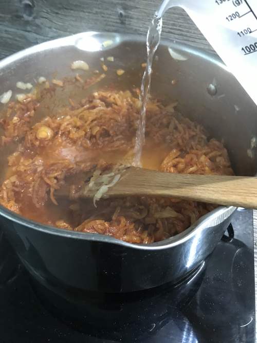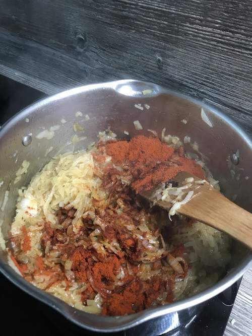 Fazole přes noc namočíme, alespoň na 10 hodin. Před vařením fazole přecedíme, vložíme do hrnce, zalijeme vodou. Vodu nesolíme. Fazole pak mírně povaříme asi hodinu, aby změknuly. A pak je scedíme. Do připraveného hrnce nalijeme čtyři lžíce rostlinného oleje a tři lžíce olivového oleje. To vše rozehřejeme a do hrnce vložíme na půlkolečka jemně nakrájenou cibuli. Když cibule změkne a zesklovatí, přidáme mletou papriku, krátce promícháme, ať paprika nezhořkne, a zalijeme zeleninovým vývarem či vodou. Dále vložíme bobkové listy, osolíme a vše necháme krátce provařit.
