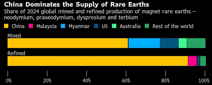 Páteční výprodeje nezasáhly jen akcie, ale také kryptoměny a komodity, především ropu. Důvod? Závěrem týdne se objevila zpráva, že Čína plánuje zpřísnit kontrolu exportu prvků vzácných zemin, u nichž má téměř monopol nejen v těžbě, ale hlavně v jejich zpracování.