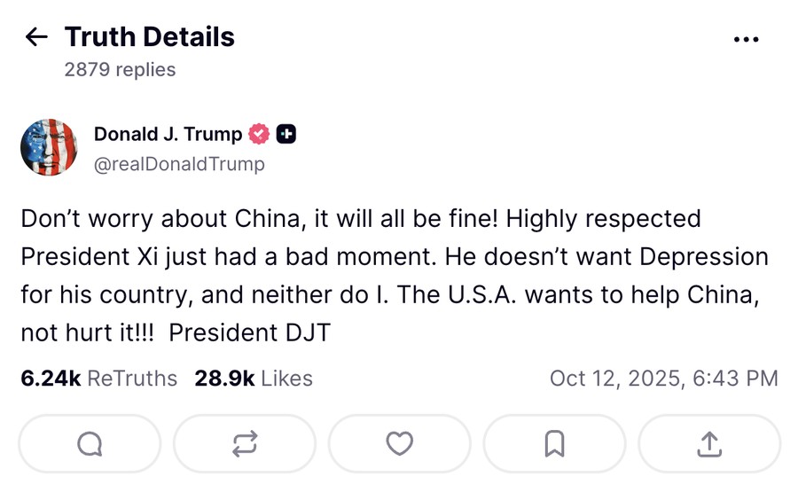 O víkendu však Trump tón svých výroků zmírnil. Na téže sociální síti napsal, že není důvod se obávat o Čínu, že její prezident nechce ekonomickou depresi a že Spojené státy chtějí Číně pomoci.