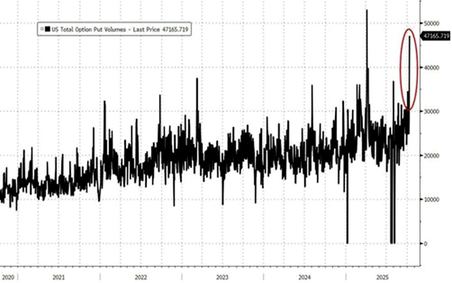 Páteční pohyby na trzích nebyly důsledkem paniky, ale spíše masivního zajišťování rizik [hedgingu]. Objem obchodů s opcemi vystřelil na druhou nejvyšší hodnotu v historii – přes 100 milionů kontraktů za jediný den. Zájem se soustředil především na indexové opce [např. S&P 500], nikoliv na jednotlivé akcie.