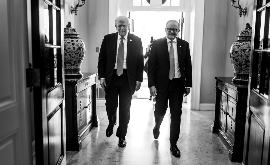 Trump ocenil australského premiéra i úspěchy země v oblasti obranné výroby a projektů zaměřených na strategické suroviny. Iniciativy, na které se podílí i Japonsko. USA podle republikánského prezidenta urychlí vývoz ponorek s jaderným pohonem do Austrálie v rámci třístranného obranného partnerství AUKUS, jehož součástí je i Británie. Na otázku, zda podle něj AUKUS odrazuje Čínu, Trump odpověděl, že ano.