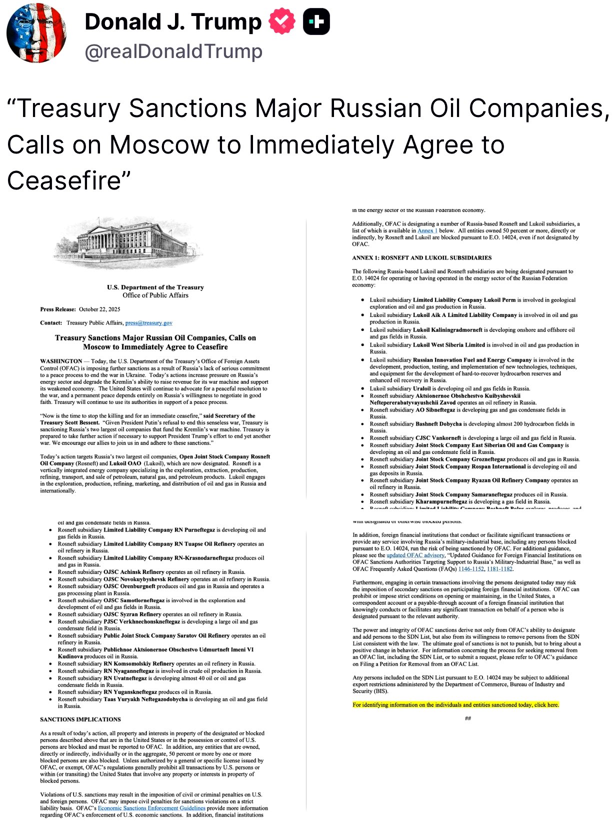 Americká agentura AP uvedla, že Washington k postihům proti ruským ropným společnostem přistoupil po měsících tlaku vyvíjeném z obou amerických politických stran na Trumpa, aby uvalil tvrdší sankce na ruský ropný průmysl. Sám Trump, který telefonicky hovořil v posledních dnech s Putinem, na své síti Truth napsal, že „opravdu věří, že úspěch na Blízkém východě pomůže v jednáních o ukončení války s Ruskem/Ukrajinou“.