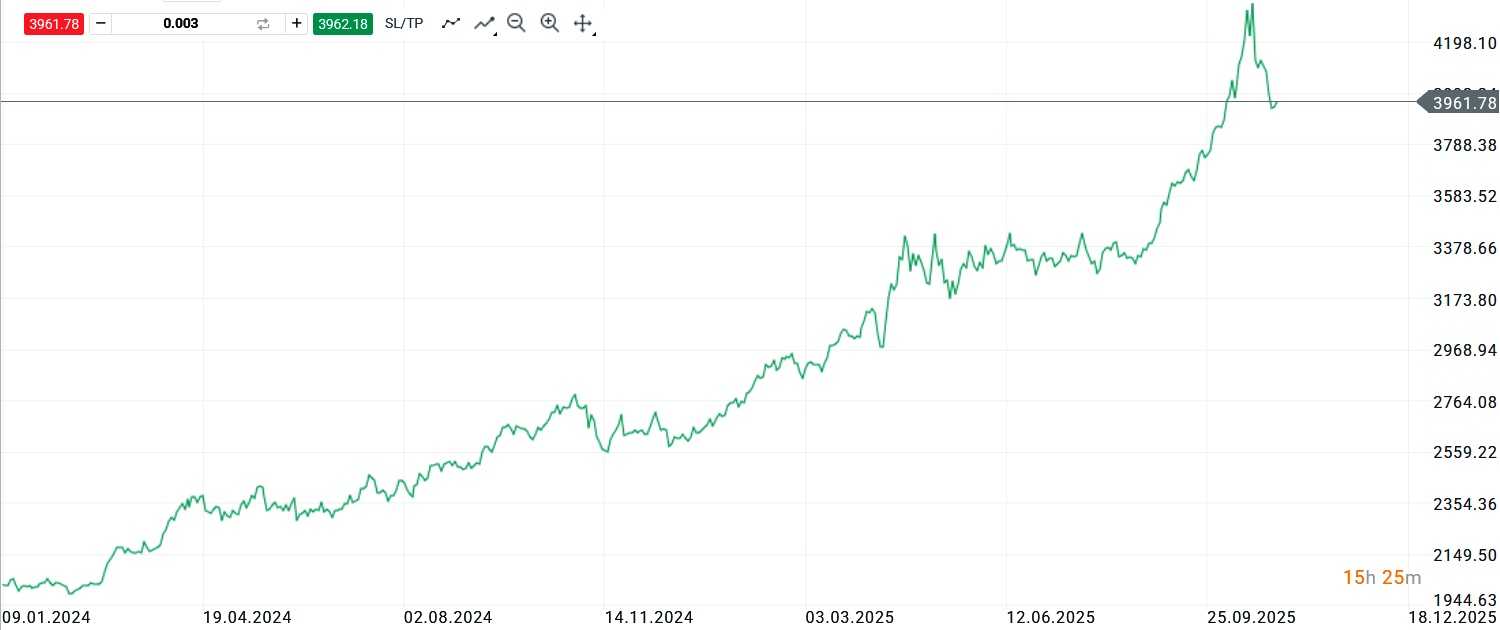 Technické ukazatele signalizují možnou korekci až k hladinám 3 950 dolarů [cca 82 753 Kč] nebo dokonce 3 675 dolarů [cca 76 991 Kč] za unci, aniž došlo na porušení celkového býčího trendu.