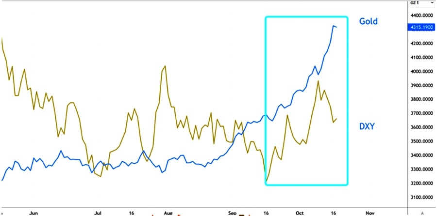Vývoj zlata [gold] a dolarové indexu [DXU]