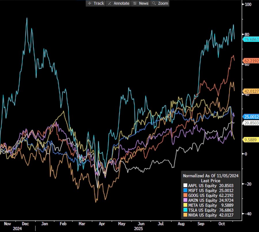 Zhodnocení akcií skupiny Magnificent 7 za poslední rok můžete vidět na grafu níže. Bez započítání dividend se pohybuje zhodnocení akcií v rozptylu 10 až 77 %. Jaká ale byla poslední výsledková sezóna?