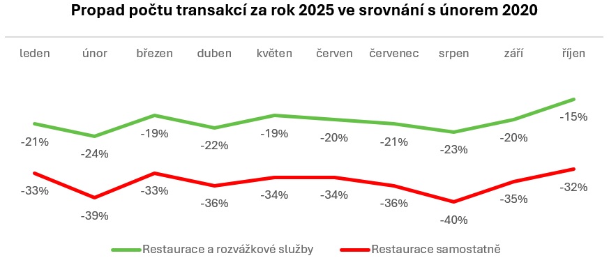 Letos v říjnu byl podle ní počet transakcí v restauracích o 32 procent nižší než na začátku roku 2020. Při pandemii covidu se propady pohybovaly až kolem 85 procent. Ještě v roce 2024 se návštěvnost restaurací držela na 34–44 procentech pod „předcovidovou“ úrovní.