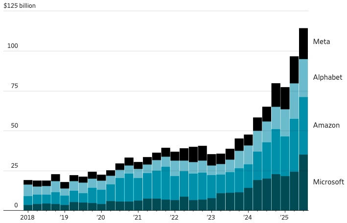 Zda jde o nový dlouhodobý trend, nebo o přechodně nafouknuté očekávání, ukáže až čas. Přesto technologické společnosti investují do AI infrastruktury obrovské částky. Jen v posledním čtvrtletí překročily společné výdaje 100 miliard dolarů [cca 2,1 bilionu Kč].
