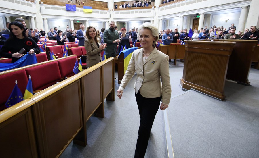 Šéfka Evropské komise Ursula von der Leyenová na neohlášené návštěvě Kyjeva v roce 2023. I tehdy stejně jako nyní byla hlavní bodem programu ruská aktiva zmrazená na území EU. A hovořilo se i o vstupu Ukrajiny do EU. / Foto: Evropská komise