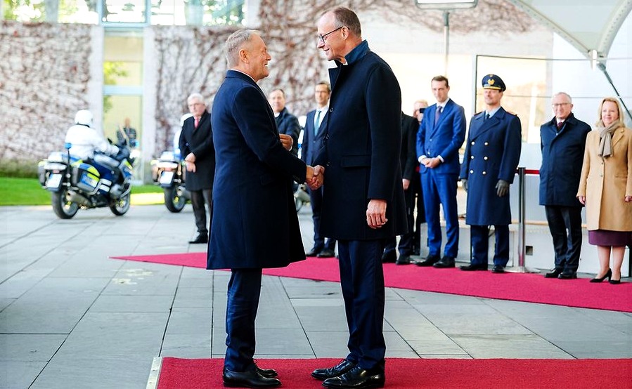 Německý kancléř Merz [vpravo] pevně tiskne ruku polskému premiérovi Tuskovi [vlevo], ale v přepočtu přes 30 bilionů korun jako reparace za škody, které Polsku způsobilo nacistické Německo, mu dát nechce. / Foto: Bundesregierung / Jesco Denzel