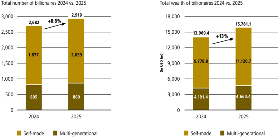 V roce 2025 přibylo 196 nových, takzvaných self-made miliardářů, kteří své bohatství vybudovali v různých odvětvích od genetiky a infrastruktury po marketingový software. Zároveň 91 dědiců zdědilo rekordních 297,8 miliardy dolarů [cca 6,2 bilionu Kč].