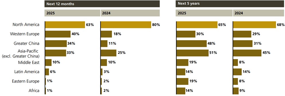 Z investičního pohledu zůstává Severní Amerika hlavním cílem, avšak její atraktivita meziročně klesla. Naopak vzrostl zájem o investiční příležitosti v západní Evropě a Asii.