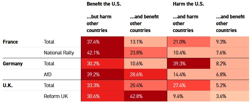 V Německu, Francii a Velké Británii příznivci pravicových politiků spíše souhlasili s názorem, že pokud zájmy země stojí proti zájmům spojenců, musí dostat přednost národní zájmy. Také si myslí, že domácí průmysl má být chráněný před globální konkurencí. Navzdory tomu mají příznivci těchto stran tendenci podporovat cla Trumpovy administrativy uvalená na evropský průmysl.