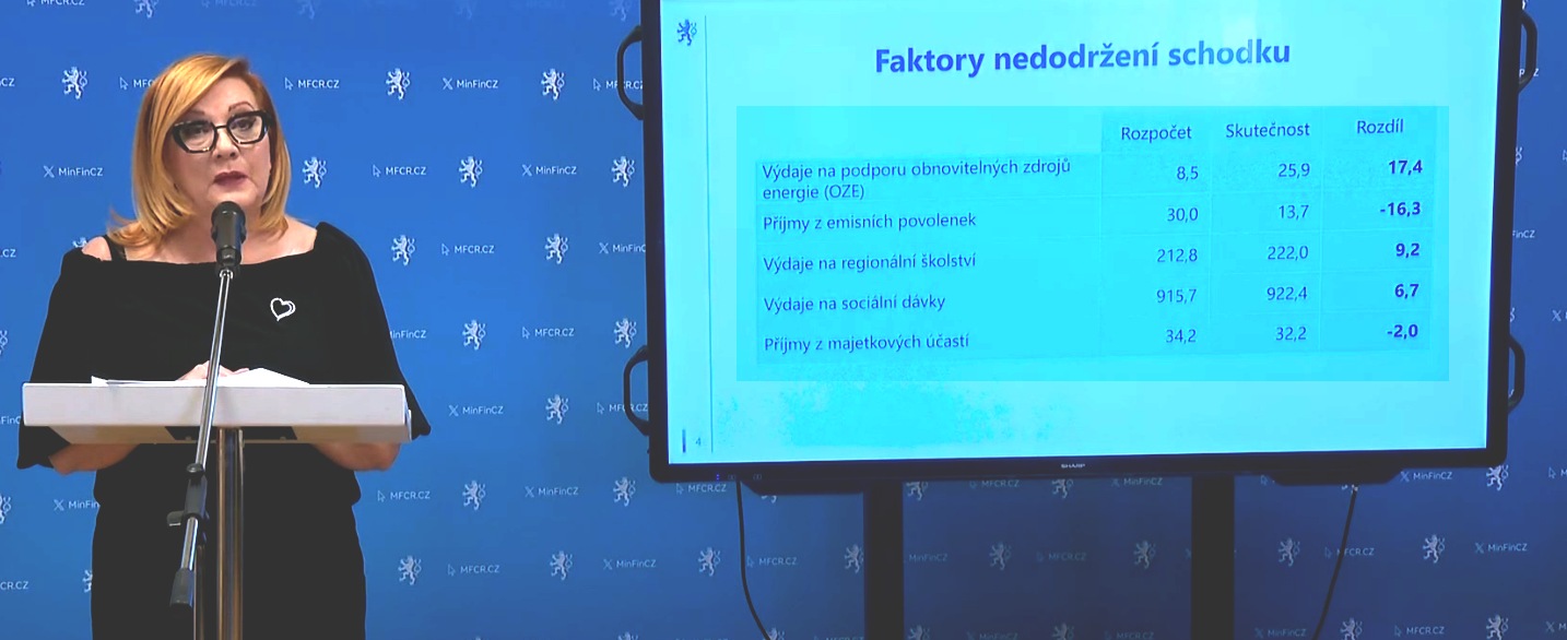 Uvedla i konkrétní příklady špatného rozpočtování. Sem zařadila podseknuté výdaje na podporu obnovitelných zdrojů [POZE], nadhodnocené příjmy z emisních povolenek, podhodnocené výdaje na regionální školství a stejně tak na sociální dávky.