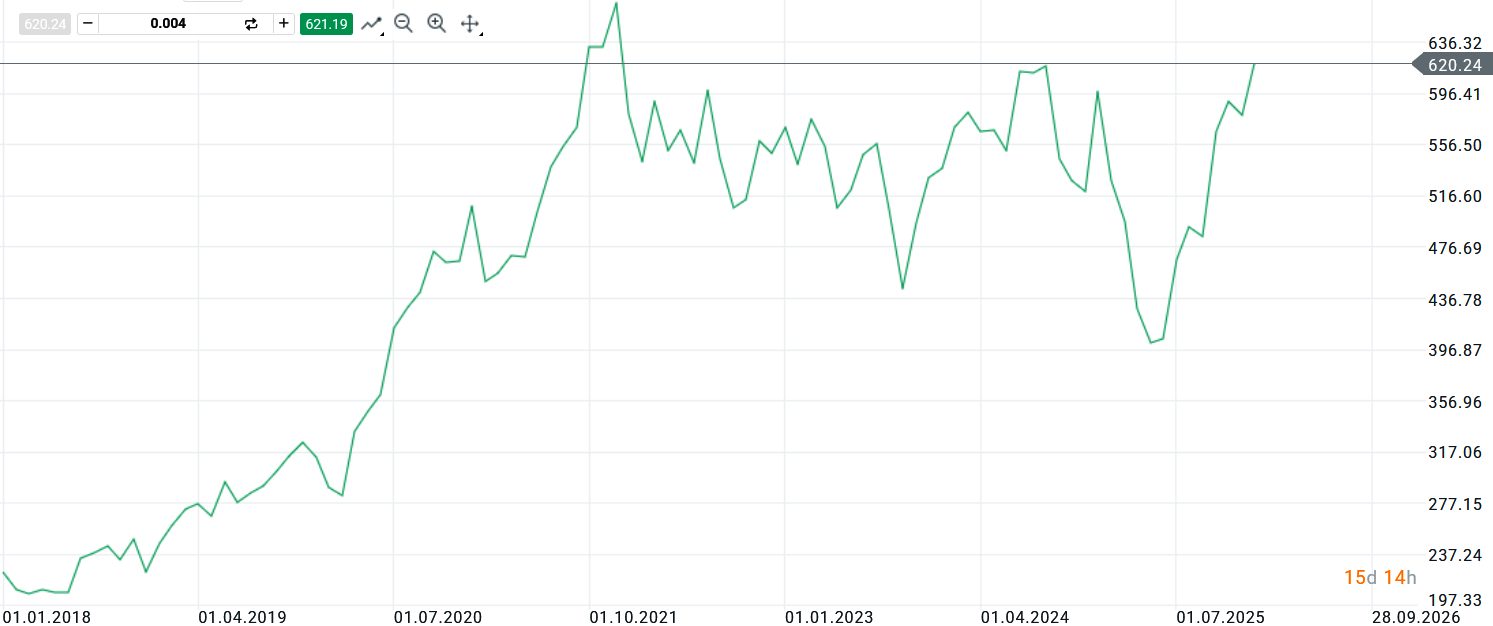 Vývoj ceny akcií Thermo Fisher Scientific od roku 2018