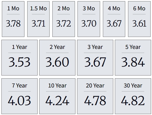 Denní výnosová křivka amerických státních dluhopisů k 23.1. 2026
