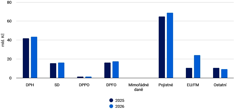 Do inkasa daně z příjmů fyzických osob ze závislé činnosti [+7,8 %, +1,0 mld. Kč] se v meziročním srovnání promítá růst mezd a platů. V případě daně z přidané hodnoty [+3,9 %, +1,6 mld. Kč] se pozitivně promítne růst nominálních výdajů domácností. A rostlo i inkaso spotřebních daní [+5,6 %, +0,9 mld. Kč].