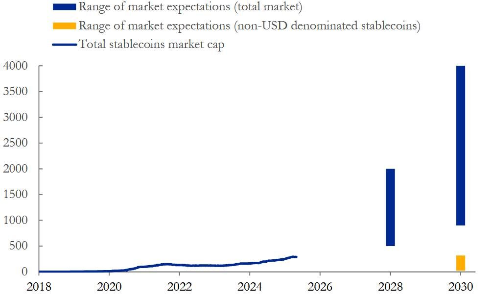 Očekávání ECB rozšíření objemu stablecoinů v mld. USD do roku 2030
