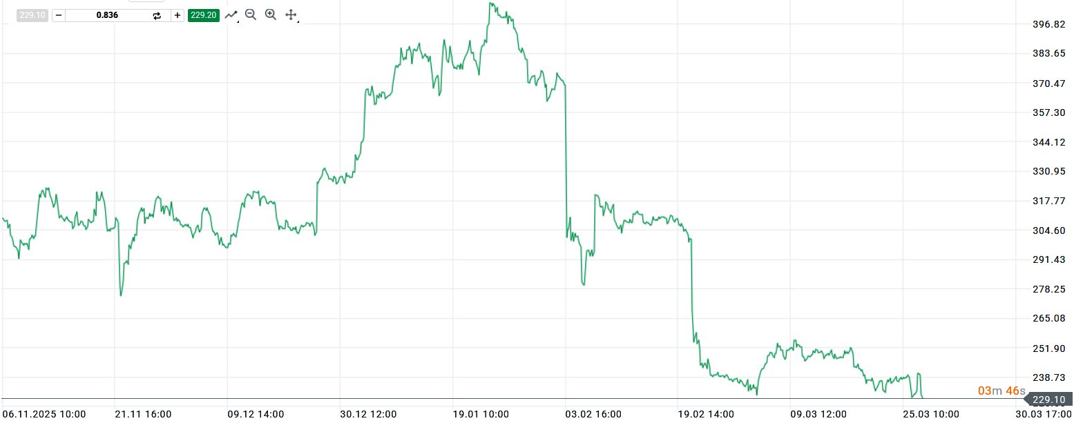 Vývoj ceny akcií Novo Nordisk od konce roku 2025