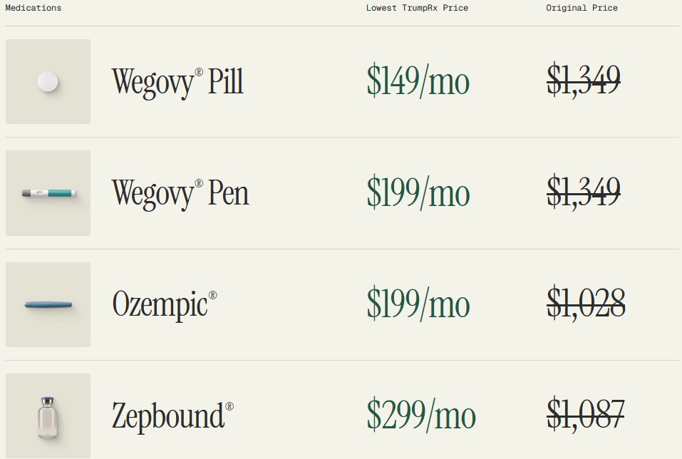 Výsledek je, že například na jím nově otevřené online lékové platformě TrumpRx jsou léky na hubnutí od Novo Nordisk nyní k mání za 149 dolarů [cca 3 172 Kč] na měsíc. Přitom před uzavřením dohody činila jejich cena 1 349 dolarů [cca 28 720 Kč] na měsíc. V podobných cenových relacích se pohybovaly i původní ceny a ceny po slevě u léků Eli Lilly [viz tabulka níže, pozn. red.].