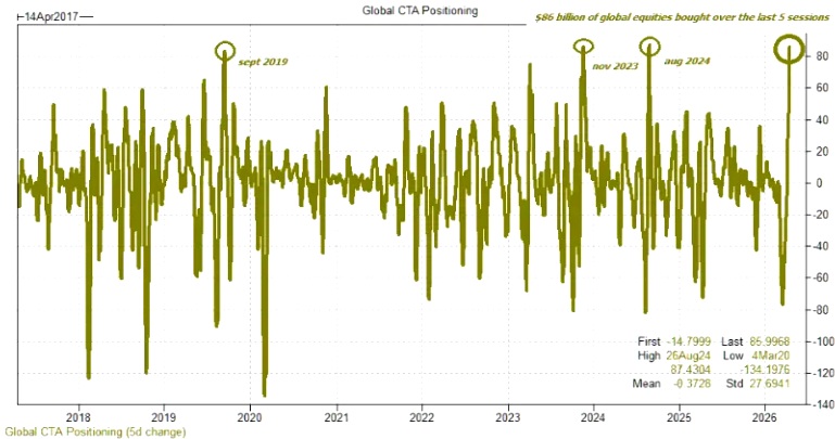 Hlavním hybatelem tohoto vývoje nejsou fundamentální zprávy, ale aktivita CTA [Commodity Trading Advisor, pozn. red.] fondů. Tyto algoritmické systémy přešly do agresivního nákupního režimu a za pět dnů alokovaly do amerických akcií přibližně 86 miliard dolarů [cca 1,8 bilionu Kč].