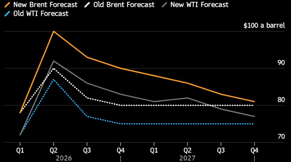 Právě tento výpadek drží ceny ropy na zvýšených úrovních. Přičemž Brent se i nadále pohybuje nad hranicí 100 americký dolarů [USD] za barel. V nové analýze proto Goldman Sachs výrazně upravila své cenové odhady směrem vzhůru. U ropy Brent banka zvýšila výhled pro 2. kvartál 2026 z původních 90 USD na 100 USD za barel.
