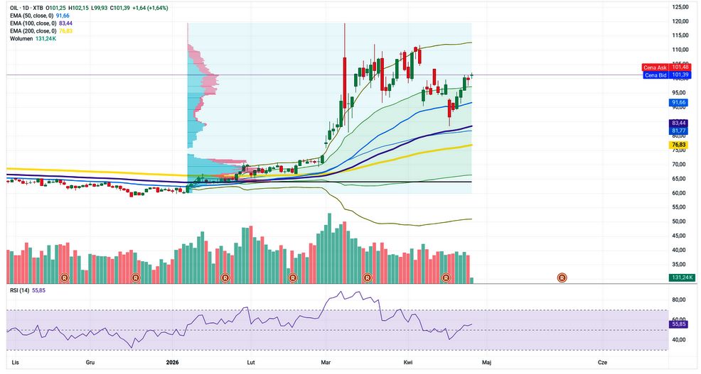 Červencový kontrakt na Brent se drží nyní nad 100 USD za barel, zatímco červnový kontrakt se obchoduje poblíž 108 USD a přibližuje se rekordním závěrečným úrovním z posledních týdnů.